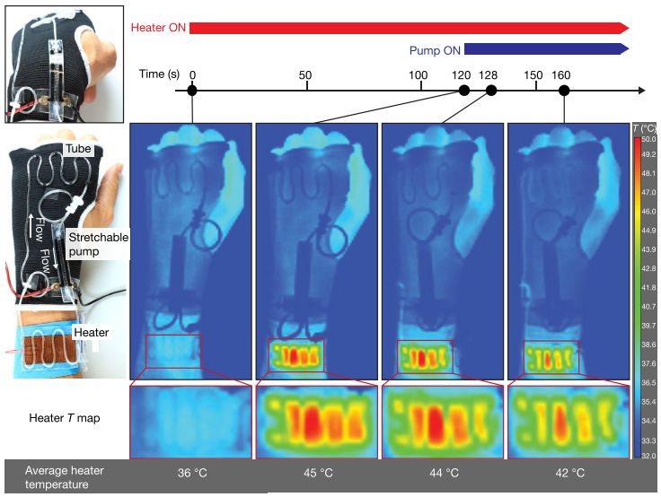 闭环流体回路包括泵和缝在纺织手套(“冷”侧)中的蛇形柔性管,以及粘合到柔性加热器(“热”侧)的蛇形柔性管。