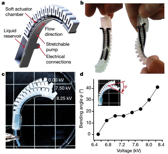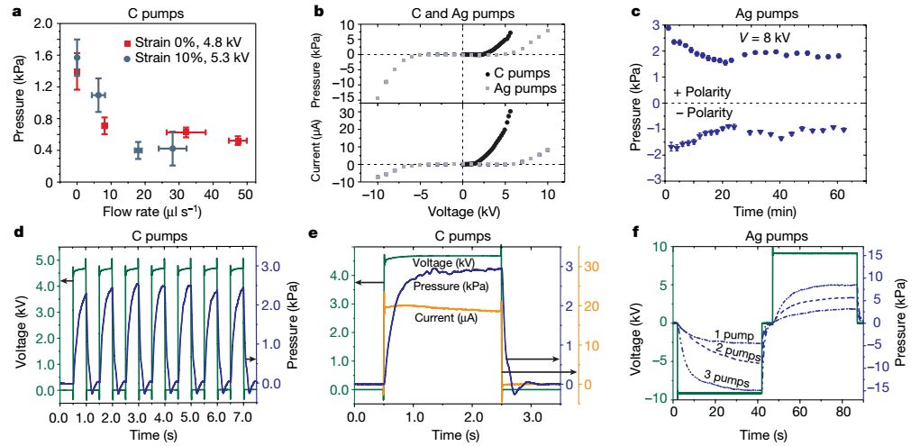 传统的泵和压缩机是由包括叶轮、轴承和电动机构成的庞大刚性系统。在工作的过程中,它们不仅需要润滑还极易产生噪音,就连基于压电执行器或电泳的微型泵也无不例外。电动柔性、可伸缩泵的缺乏阻碍了流体驱动软体系的多方面应用,例如机器人和机电一体化(致动器和传感器)、生物学(细胞培养的微流体)和可穿戴设备(热量分配)等。
