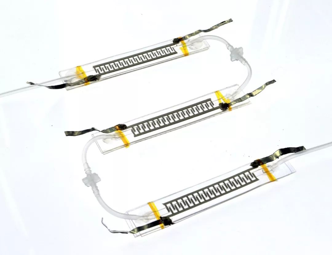 顶层和底层是厚度为0.4mm的PDMS膜,其上图案化30μm厚的柔性电极。
