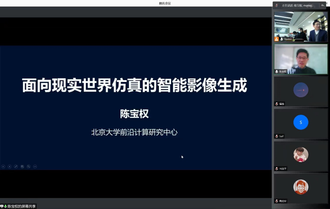 接着,北京大学博雅特聘教授陈宝权带来了题目为“面向现实世界仿真的智能影像生成”的报告,报告主旨讲述了现实场景的三维捕获、重建与模拟仿真在深度学习与人工智能的推动下正在发生革命性的改变,反映在物理逼真并实时交互的视觉效果生成。本报告将介绍三维场景的获取、物理现象的模拟与人体动作的控制等影像生成技术的前沿进展。这些将给影视制作、虚拟现实、增强现实与数字孪生等应用领域带来新的机遇,特别有意义的是,将为人工智能的模型设计提供参考,对训练学习提供虚拟仿真环境。