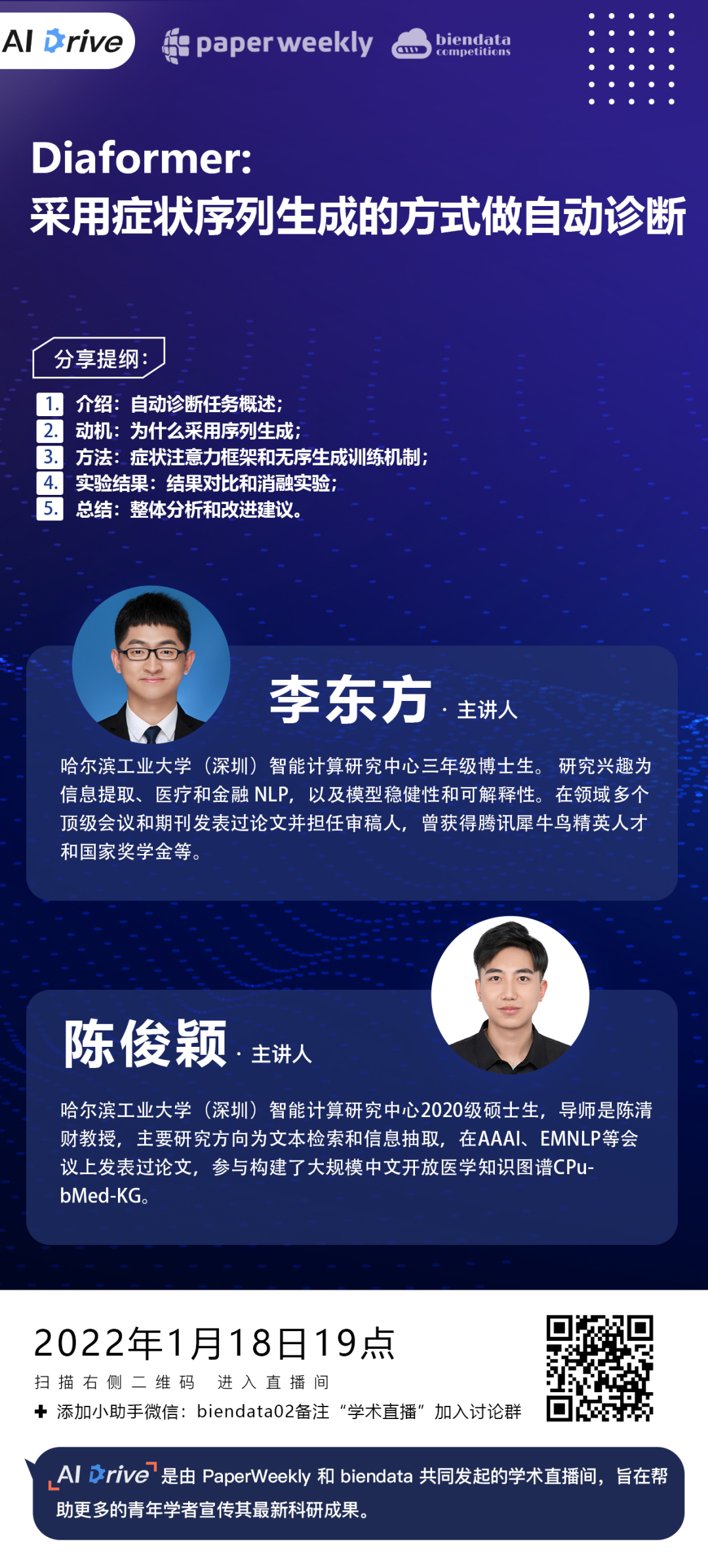本期 AI Drive,我们邀请到哈尔滨工业大学(深圳)智能计算研究中心的博士生李东方和硕士生陈俊颖,为大家在线解读他们发表在 AAAI 2022 的最新研究成果:Diaformer: Automatic Diagnosis via Symptoms Sequence Generation。对本期主题感兴趣的小伙伴,1 月 18 日(本周二)晚 7 点,我们准时相约 PaperWeekly 直播间。