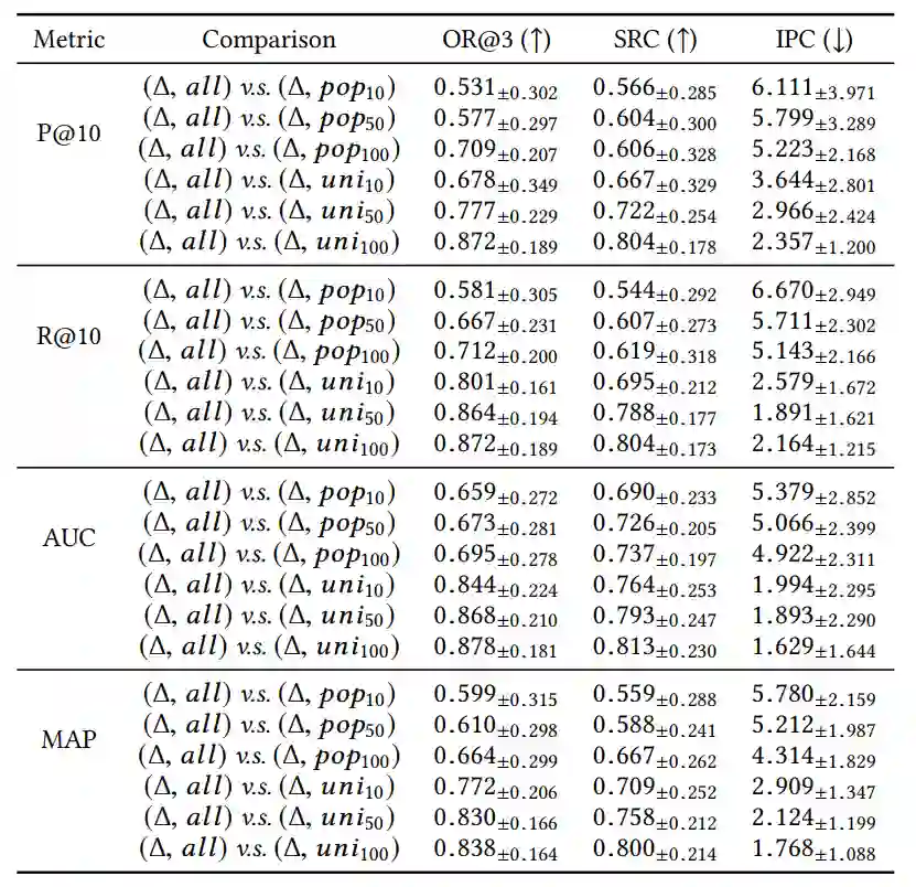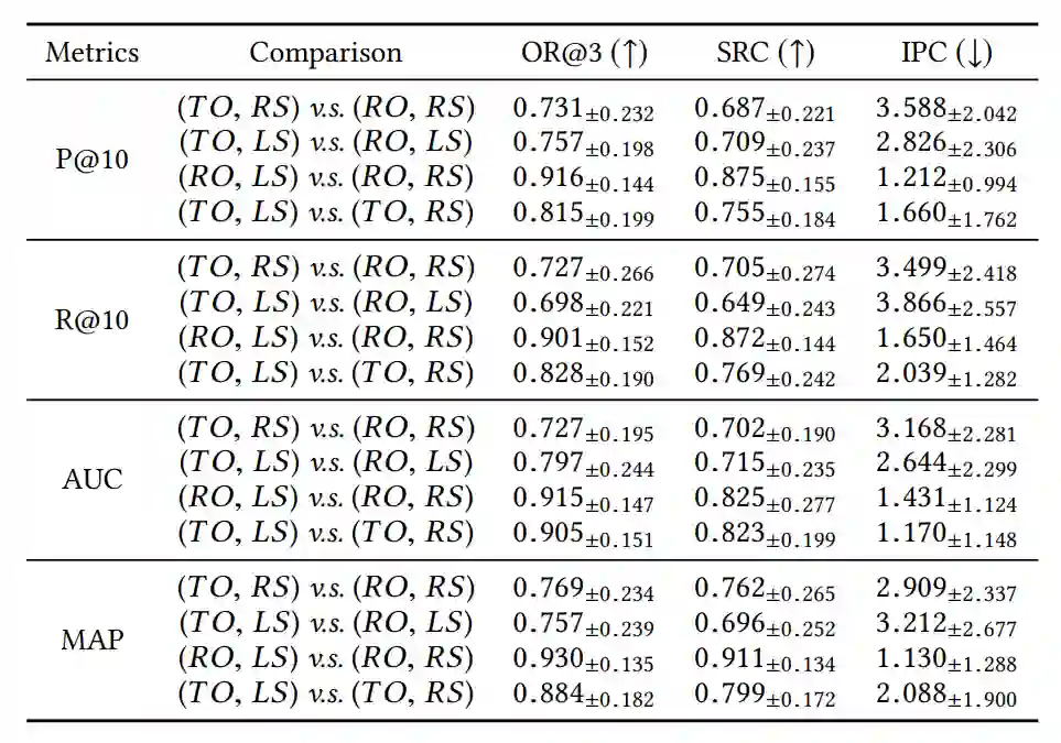 选择这三种方法的理由如下。SRC刻画了整体排序的相关性,IPC提供了对SRC值的更直观的理解,对于商品推荐,排名靠前的位置需要更多关注,可由OR@k刻画。