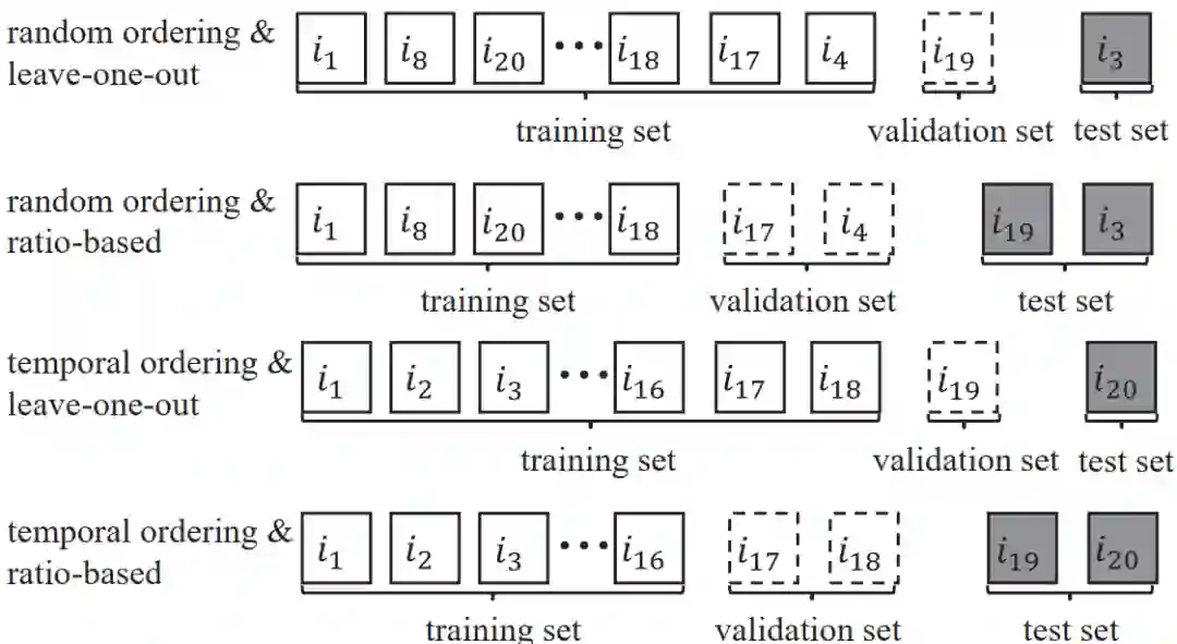 图1:四种切分策略的说明性示例。用户与20个物品交互。项目i的下标表示与用户的交互顺序:较小的索引表示较早的交互时间。我们使用标准、划线和灰色框分别表示训练集、验证集和测试集。