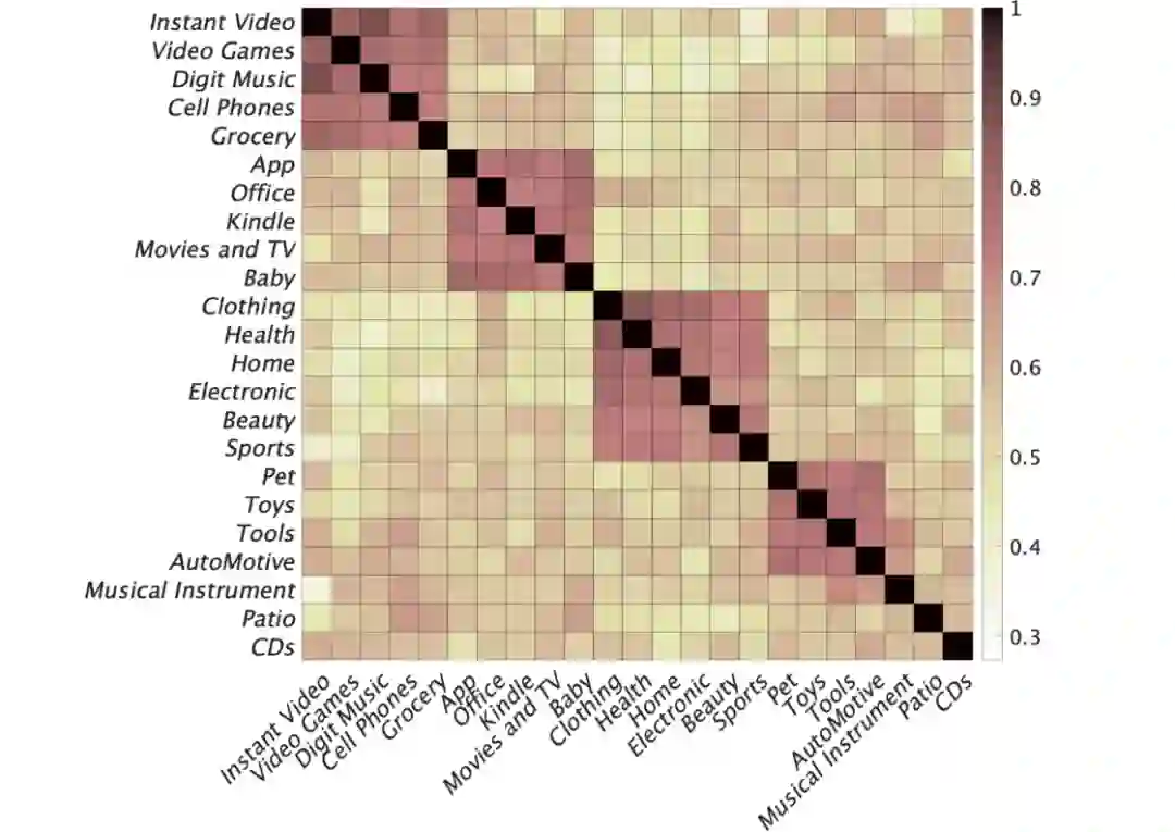 实验结果。图2显示了两个领域之间的平均相关结果。我们对行和列进行重新排序,以便可以在对角线上聚合较大的值。有趣的是,整个热度图似乎包含四大块(组),其中组内相关值高于组间相关值。结果表明,在相同的配置下,不同的领域可能会产生不同的表现排名。因此,评估时应考虑领域差异。通过对数据集的考察,我们发现领域特征(例如,第一组主要对应于数字产品)和稀疏程度(如用户-项目交互比率)似乎对相关结果有显著影响。使用多个来来自于不同领域、稀疏度不同的数据集是个好方法。这里,“领域”是指Amazon数据集的类别。我们将在未来的工作中使用更多的数据集来研究这个问题。