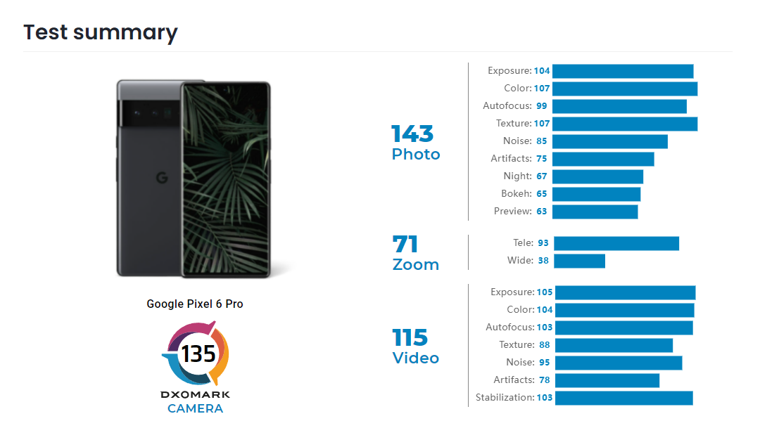 谷歌 Pixel 6 Pro 照片得分 143 分,DxOMark 表示谷歌特别关注对比度、人像质量和肤色,静止图像显示出良好的曝光度,在室外和室内条件下也能提供高水平的细节拍摄,不足在于在困难的背光场景中有一些轻微的曝光不足,在室内照明或低光下拍摄时通常会出现噪点。