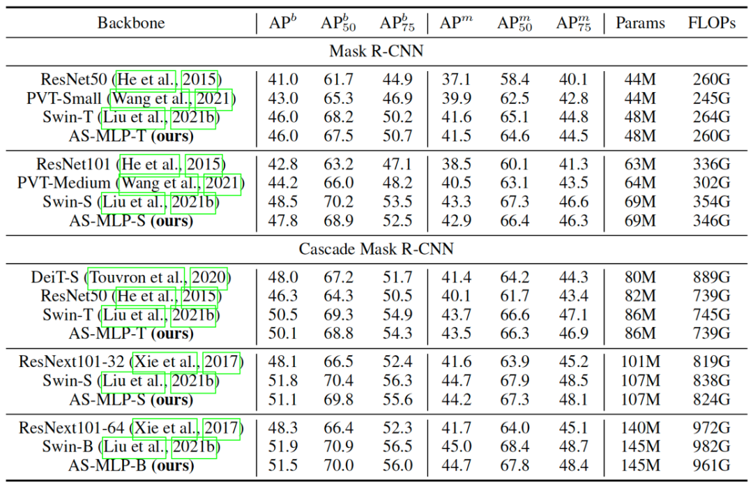 目标检测和实例分割的结果见表二,值得注意的是,我们没有将我们的方法与 MLP-Mixer 进行比较,因为它使用固定的空间维度进行 MLP操作,目标检测的输入尺寸不是固定的,因此不能迁移到目标检测中。据我们所知,我们是第一个将基于 MLP 的架构应用于目标检测的工作。我们的 AS-MLP 在类似的资源限制下实现了与 Swin Transformer 相当的性能。具体来说,Cascade Mask R-CNN + Swin-B在145M参数下达到51.9 ,Cascade Mask R-CNN + AS-MLP-B在145M参数下获得51.5