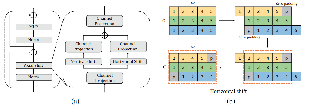 图二:(a)显示了AS-MLP块。(b)显示了水平位移。