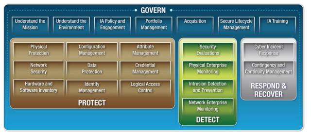 CGS2.0标准框架强调了网络空间安全四大总体性功能:治理(Govern)、保护(Protect)、检测(Detect)和响应与恢复(Respond & Recover),如图5所示。其中,治理功能为各机构全面了解整个组织的使命与环境、管理档案与资源、建立跨组织的弹性机制等行为提供指南;保护功能为机构保护物理和逻辑环境、资产和数据提供指南;检测功能为识别和防御机构的物理及逻辑事务上的漏洞、异常和攻击提供指南;响应与恢复功能则为建立针对威胁和漏洞的有效响应机制提供指南。