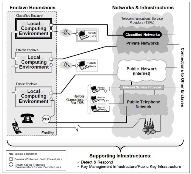 IATF将信息系统的信息保障技术层面划分成了四个技术框架焦点域:局域计算环境(Local Computing Environment)、区域边界(Enclave Boundaries)、网络和基础设施(Networks & Infrastructures)、支撑性基础设施(Supporting Infrastructures),如图3所示。在每个焦点域内,IATF都描述了其特有的安全需求和相应的可控选择的技术措施。IATF提出这四个焦点域的目的是让人们理解网络安全的不同方面,以全面分析信息系统的安全需求,考虑恰当的安全防御机制。