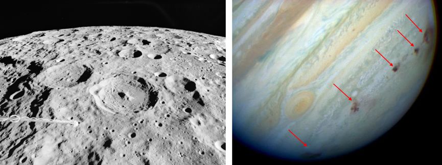 左:满目疮痍的月球高地;右:彗木相撞后在木星上留下的红褐色斑点。图片来源:NASA