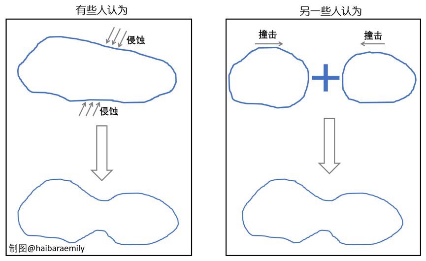这类哑铃型小天体是如何形成的?多年以来一直是科学家们争议的话题。有两种猜测。一种是侵蚀说——一整块细长型小天体经过局部性的质量损失和风化侵蚀,最终变成了哑铃状;一种是撞击说——两个小天体各自形成,然后因为碰撞而连接起来的。