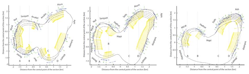多视角的地层和重力方向关系,黄色为重力方向,虚线为地层位置,两者几乎处处近乎垂直。图片来源:文献[1]