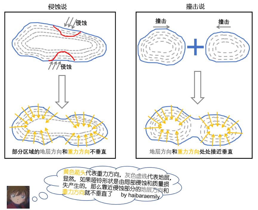 显然,侵蚀说和撞击说产生的地层特征应当是不同的。如果哑铃结构是由局部侵蚀产生的,那么靠近侵蚀部分的地层方向和重力方向就不垂直了。