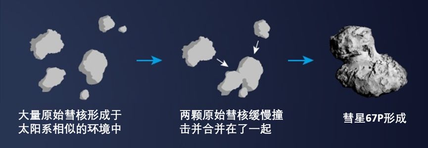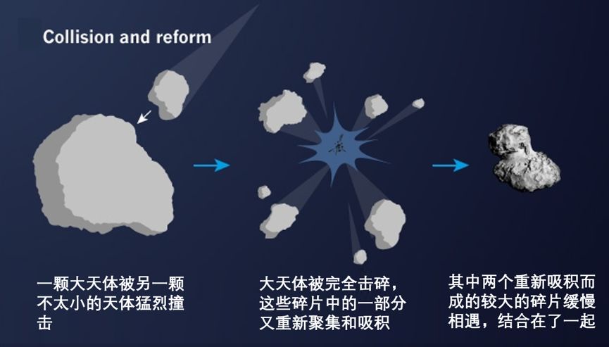 那如果是大小差不多(量级上可比)的天体呢?如果速度还很快呢?这样的撞击就可能是毁灭性的,大天体也不能幸免,也会被撞得粉碎。灾难性撞击说就是基于这种撞击事件的进一步猜想:一颗被毁灭性大撞击完全击碎的大天体的千百万块碎片中,一部分碎片又重新聚集和吸积,两块较大的碎片结合成了如今的彗星67P。这样的撞击事件在整个太阳系的各个阶段都在不断发生,并不是太阳系早期独有的。所以如果这个假说是真的,那么虽然彗星67P的两个“哑铃头”依然保留着太阳系最古老的特征,但如今这个合并的模样可能其实很年轻。