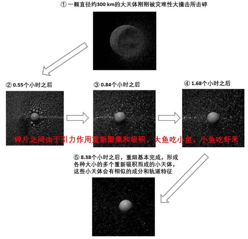 灾难性撞击之后碎片的重组过程。图片来源:参考文献[3] | 翻译:haibaraemily