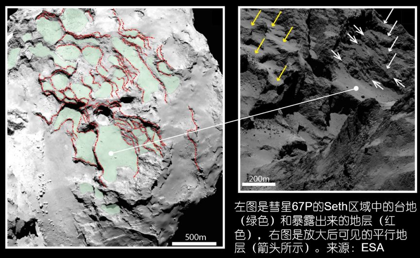 左图是彗星67P上Seth区域中的台地(绿色)和暴露出来的地层(红色)。右图是放大后的平行地层。图片来源:ESA