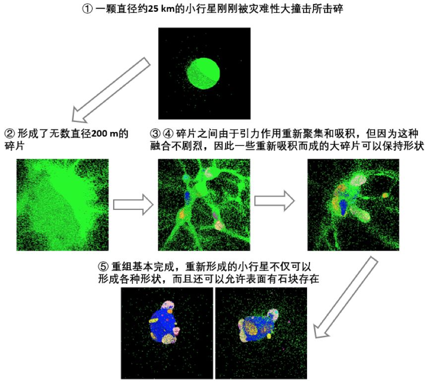 Michel的模拟结果虽然极其精彩,但也有明显的粗糙之处——为了简化,所有的碎片和碎片的重组体都以球形模拟,而没有考虑它们的实际形状。于是2013年,Michel及同事又做出了一些改进,改进后的模拟结果表明,这种灾难性大撞击之后的重组可以形成各种形状的小天体[3]。