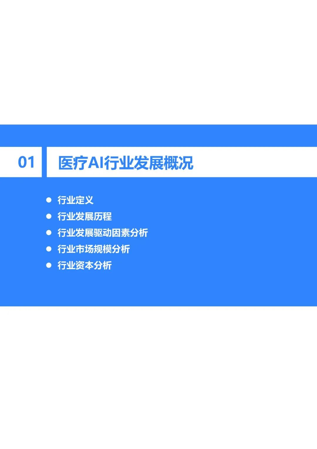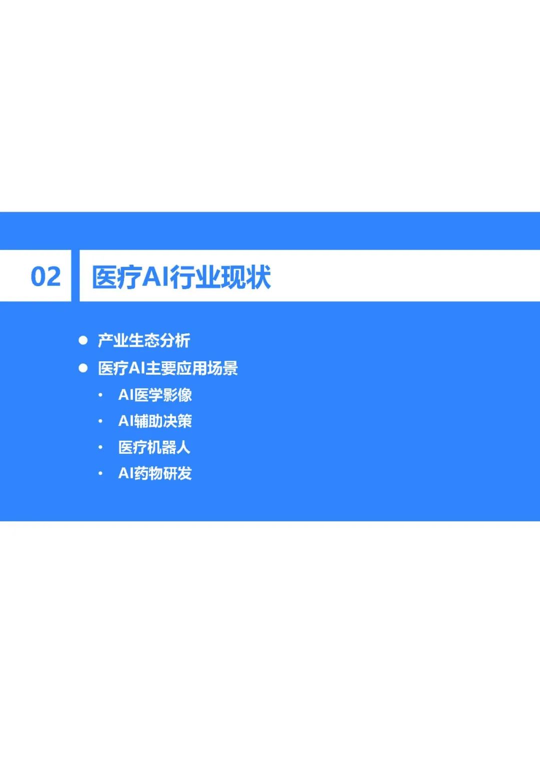 医疗AI是指将人工智能技术应用于医疗领域中,主要包括医学影像、临床辅助决策、精准医疗、健康管理、医疗信息化、药物研发以及医疗机器人等细分场景,以助力降本增效、提升诊疗水平、改善患者体验、降低患病风险等为核心目的,全面赋能院前、院中、院后各个环节。
