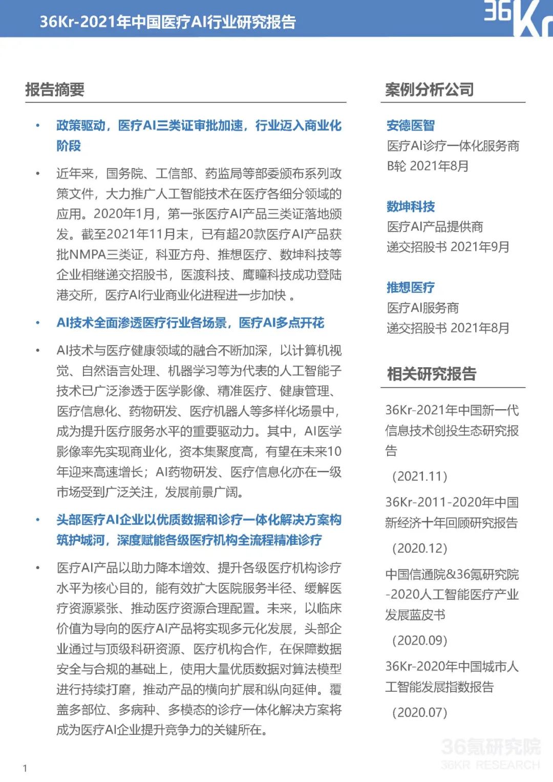 后台回复“AIM36” 就可以获取《36氪研究院 | 2021年中国医疗AI行业研究报告,40页pdf》专知下载链接