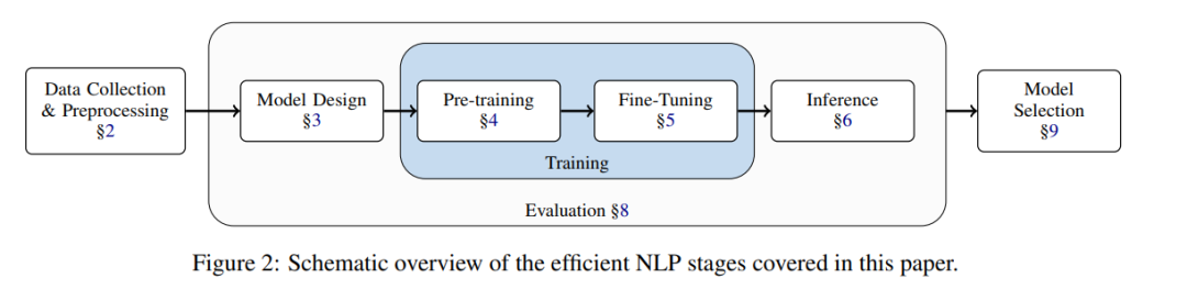 该研究旨在对提高 NLP 效率的广泛方法做一个基本介绍,因此该研究按照典型的 NLP 模型 pipeline(下图 2)来组织这次调查,介绍了使各个阶段更高效的现有方法。