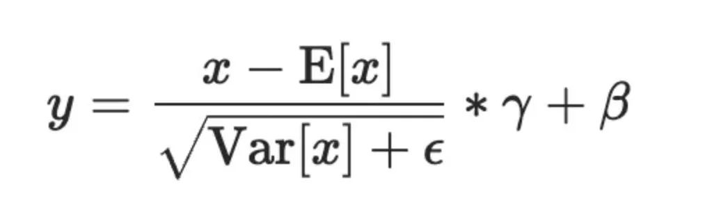 例如对于输入 x 形状为 \(N, C, H, W\), normalized\_shape为 (H, W\) 的情况,可以理解为输入 x 为 \(N\*C, H\*W\),在 N\*C 个行上,每行有 H\*W 个元素,对每行的元素求均值和方差,得到 N\*C 个 mean 和 inv\_variance,再对输入按如下 LayerNorm 的计算公式计算得到 y。若 elementwise\_affine=Tru,则有 H\*W 个 gamma 和 beta,对每行 H\*W 个的元素做变换。