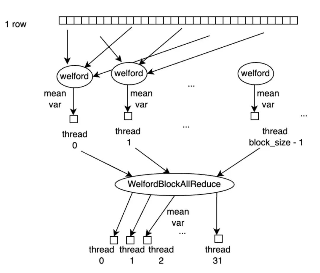 WelfordBlockAllReduce\<ComputeType>\(thread\_mean, thread\_m2, thread\_count, \&row\_mean, \&row\_m2,