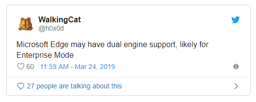 微软即将发布的新版 Edge 浏览器很可能同时包含 ChromiumBlink 和 MSHTML(又称 Trident)两个浏览器内核,方便浏览器给那些为 IE 设计的网站提供向后兼容性。