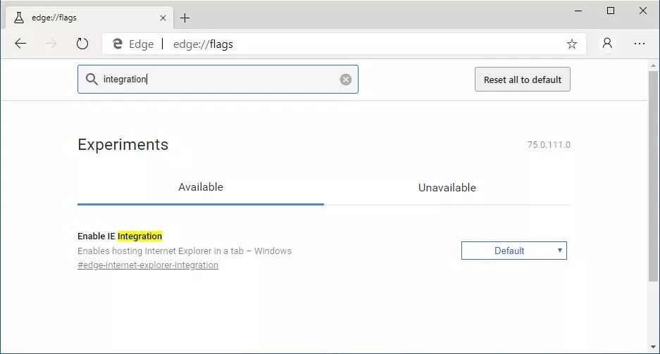 在 MicrosoftEdge 内部构建版本 75.0.109.0 及更高版本中,edge://flags 多了一个名为 "Enable IE Integration" 的实验标志。标志启用后,同名选项将出现在 Edge 的菜单。