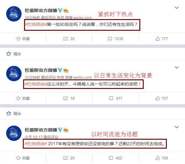 从与避孕套等核心产品有关的广告话题,到情感、两性的用户话题,再到贴近生活的日常话题,杜蕾斯总能找到或有趣或新奇或扎心的切入点,以简单的几句文案作话题引导,或引发粉丝共鸣、或刺激粉丝的好奇心与探知欲、或勾起粉丝的表现心理,从而让消费者积极、主动地、踊跃地进行回复和讨论。