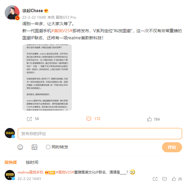 realme 真我中国区总裁徐起今日在微博上宣布将推出新一代国潮手机“真我 V25”。他表示 V 系列定位“科技国潮”,这一次不仅有非常重磅的国潮 IP 联名,还将有一项 realme 首款新科技!”此外,徐起还表示,realme 要做年轻人最喜爱的科技潮牌,希望国潮能在科技行业继续绽放,更希望国潮能在国门之外走得更远。