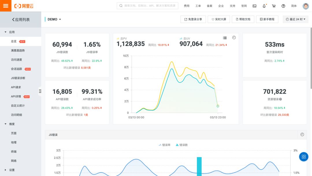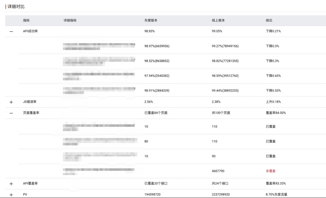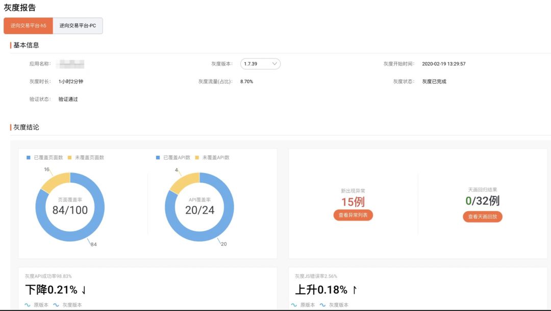 前端灰度监控的核⼼⽬的是让前端灰度发布的结果有据可依。在灰度发布期间,监控会重点关注前端灰度环境和线上环境对⽐后⻚⾯访问速度变化、JS 错误率变化、新出现的 JS 异常以及 API 成功率变化,⾃动⽣成灰度监控报告,同时也会通过灰度流量⻚⾯覆盖率、API 覆盖率来判定是否需要延⻓灰度时⻓或加⼤灰度流量⽐例。