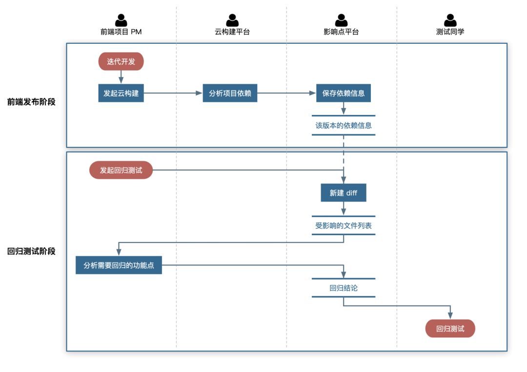 在回归测试阶段,我们需要明确知道本次前端版本迭代所造成的影响点,以供开发同学⾃测或者是测试同学重点回归相应部分,⽆论是⼈⾁测试,还是⾃动化回归,到很依赖这个关键信息。另外⼀种常⻅的场景是,前端代码本身没做任何改动,但是由于依赖的⼆⽅/ 三⽅包⾃动升级,导致某些场景出现⽆法预料的问题。这些都是因为前端迭代影响点⾃⾏评估不全⾯可能触发故障的典型场景。为了解决前端迭代中⽆法准确给出回归点的问题,我们提供了迭代影响点评估⼯具,重点提供以下能⼒: