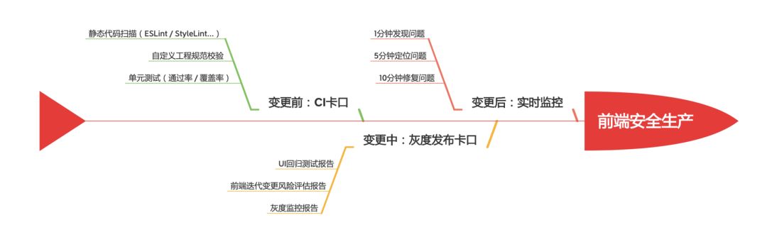 讨论到这⾥,我们也有了“前端安全⽣产”的⼀个基本定义。“前端安全⽣产”专注于前端研发全链路的⾼质量交付,在前端应⽤开发、发布、线上运⾏三个关键阶段,通过⼀系列的⾃动化流程机制,控制前端代码⻛险,保障线上业务运⾏稳定,⽤机制保护⼈,不给前端同学引发线上故障的犯错机会,最终规避损失或者降低损失。