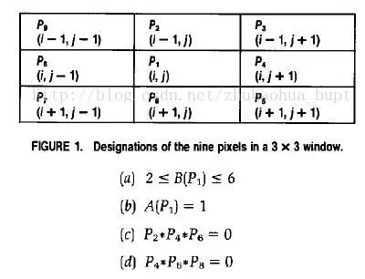 这个算法是论文[2]提出的,该算法每一次的迭代步骤是对符合特定条件的目标像素,进行腐蚀,效果就是目标变得越来越细。不断的迭代,直到在上一次腐蚀后的目标在本轮操作中,没有新的像素点被腐蚀,算法结束。