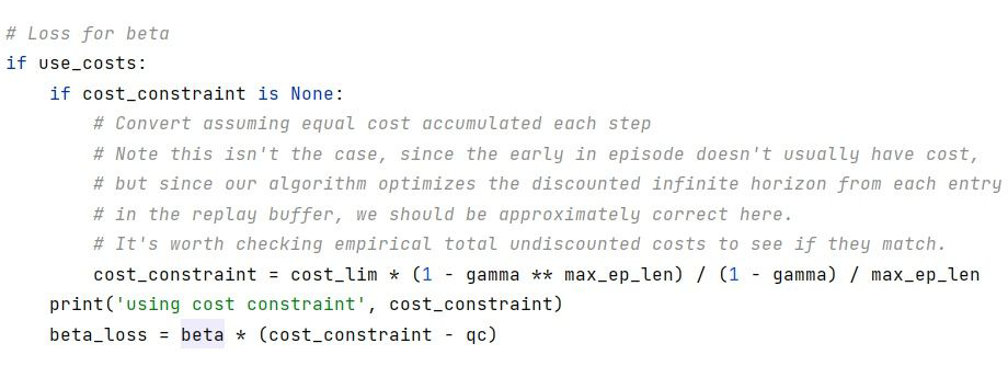 在实验中我发现这种方法存在一定的问题,在实际场景中我们的约束条件是有一定物理意义的,例如一段时间内机器人的能量消耗必须小于一定的阈值,保证机器人的正常运作,这里的阈值是根据无折扣的代价之和求得的,但是在上面的算法流程中,利用了一个神经网络去拟合代价对应的 Q 值,这里的 Q 值对应的是有折扣的代价收益,与奖励对应的收益类似,因此这里的代价 Q 值和我们实际中的代价之和是有区别的。在 open AI 提供的实验中,代价比较简单,通常为 1,此时 open AI 的代码在假设每个 step 都有代价,且均为 1 的情况下,利用有折扣代价之和与无折扣代价之和之间的等式关系: