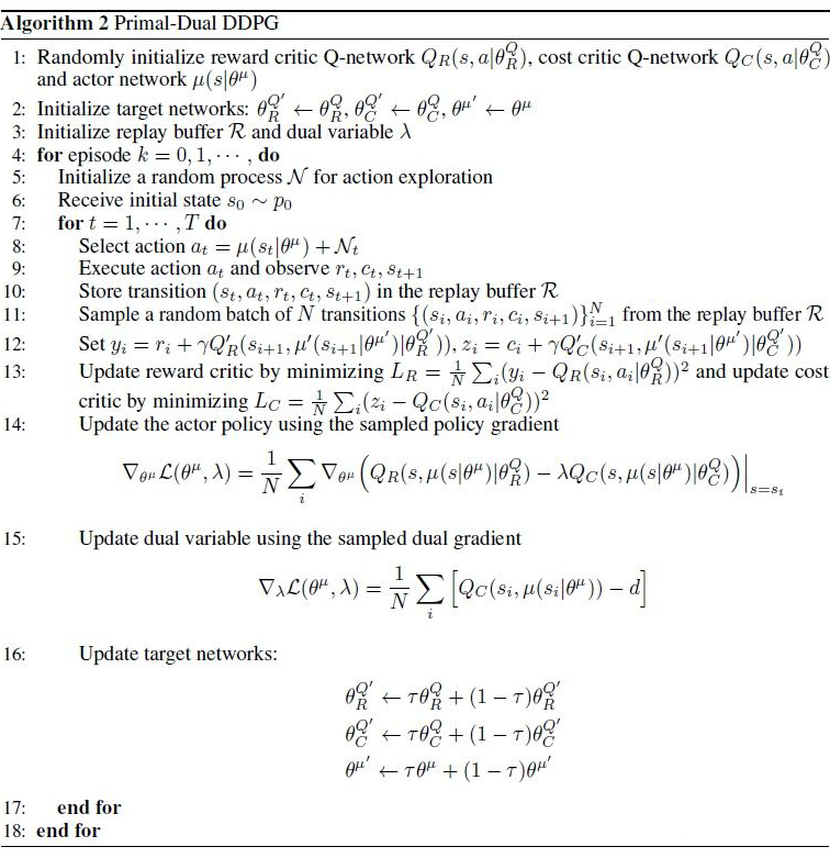 这里提供 DDPG 算法的原始-对偶优化版本用于求解 CMDP,该算法中的原始策略更新与对偶变量更新均利用经验回访池中的 off-policy 数据样本。为了方便描述,假设此时 CMDP中只存在 1 个约束,多个约束的情况也可以轻易地扩展得到。在原始-对偶 DDPG 算法中,存在以下几个神经网络:
