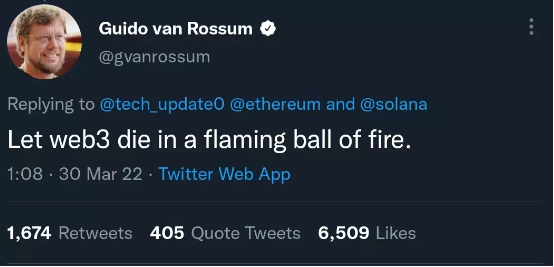 Python 编程语言的创造者 Guido Van Rossum 不久前就曾发推文指出:就让燃烧的火球把 Web3 摧毁殆尽吧。