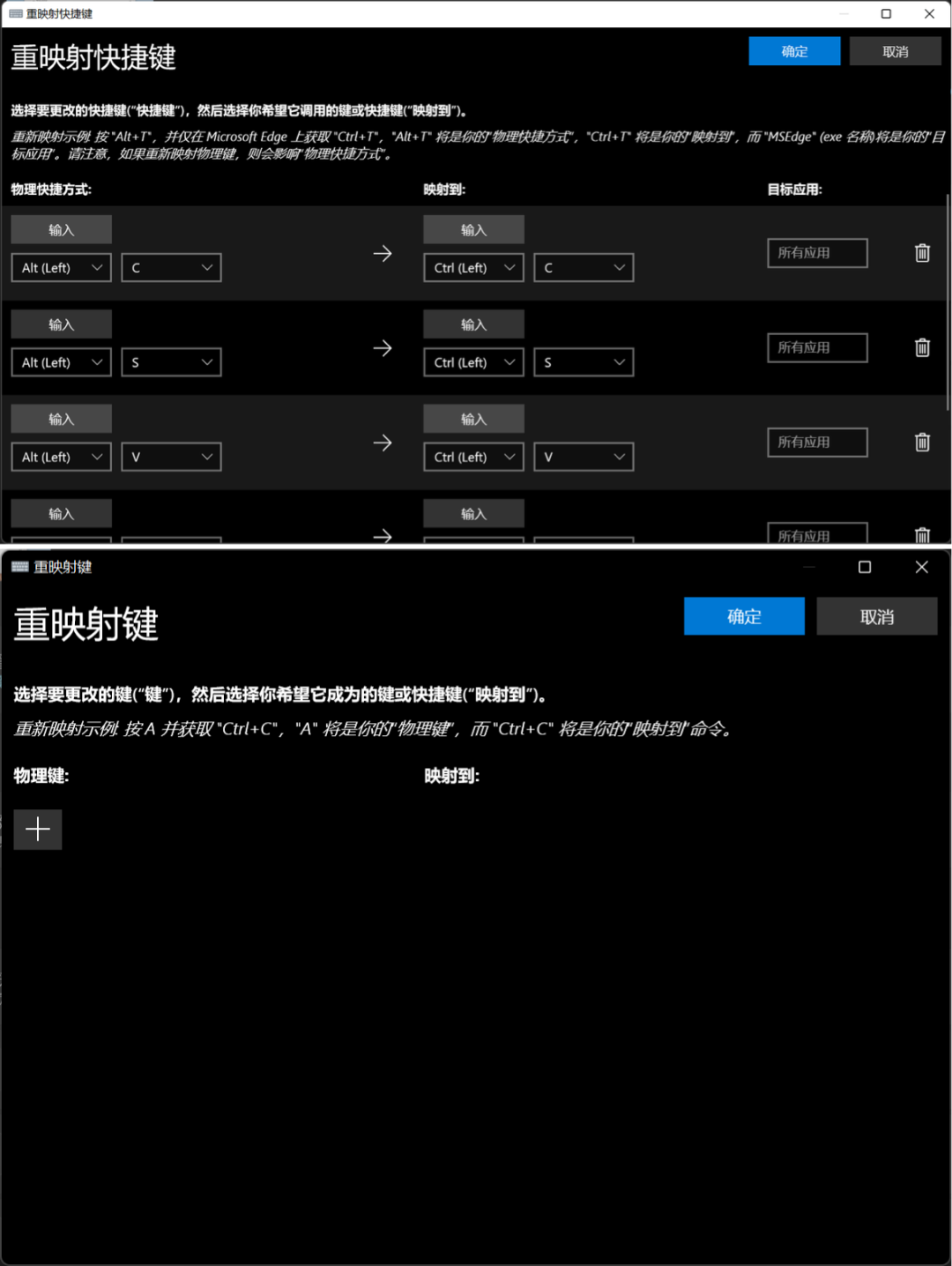 在 PowerToys 的键盘管理器中,你可以自定义「重映射键」或者「重映射快捷键」。前者的作用是当按下某一按键时,替换为另一个或另一组按键,只能「一对多」;后者则是按下某一按键或组合键时,替换为另一按键或组合键,对应关系不局限于「一对多」,且可以指定目标应用。