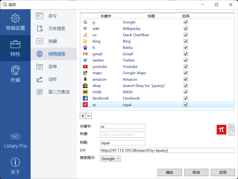 而 Listary 的网络搜索和自动定位则是让我放弃使用 PowerToys Run 的「罪魁祸首」。相较于 PowerToys Run 只能使用 Bing 进行搜索,Listary 提供了许多网络搜索选项,你可以使用关键字触发网络搜索,且会提供搜索建议。如果内置的网络搜索仍然不能满足你的需求,你也可以添加自定义搜索。例如,我就添加了由会员派友制作的少数派搜索。