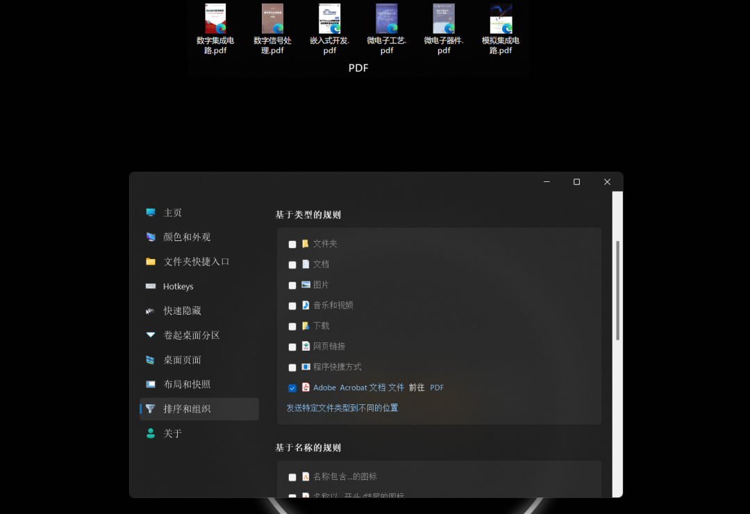 只需要在 Fences 的「排序与组织」中添加相应规则,Fences 便会将你扔到桌面的文件自动放入对应的分区。例如,我设置了将 .pdf 文件归入 PDF 分区,我只需要将常用的电子教材拖动到桌面,Fences 便会将它们整齐的排列在分区中,方便查找。