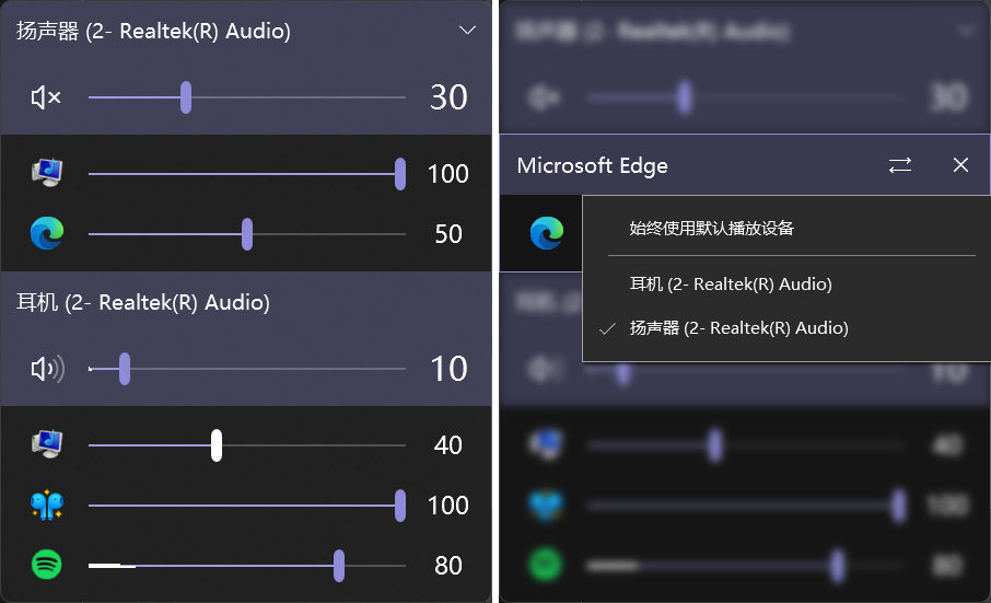 EarTrumpet 还可以自由调整应用程序的播放设备,你可以在耳机中收听播客,在扬声器中播放白噪音;或者在不希望拔掉耳机时,将需要播放的设备切换至扬声器。如果你会经常有多个应用程序同时播放音频,EarTrumpet 可以帮助你管理它们的播放设备和输出音量。