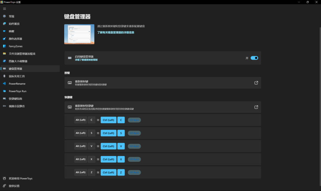 如果你刚从 macOS 切换到 Windows,或者希望修改快捷键触发方式,不妨试试 PowerToys 的键盘管理器。