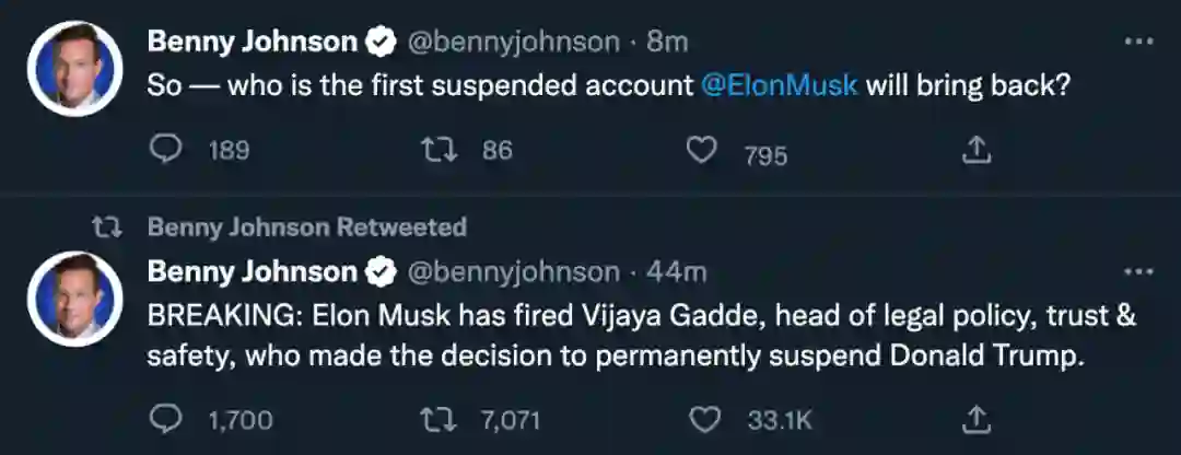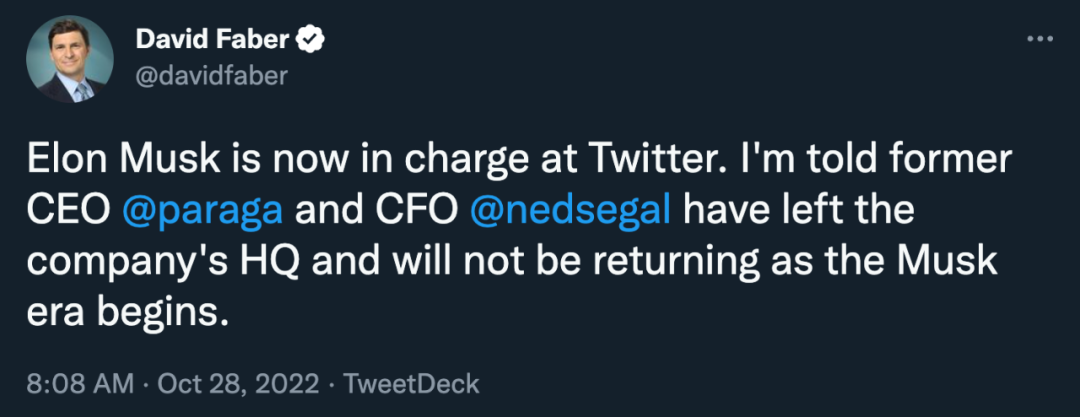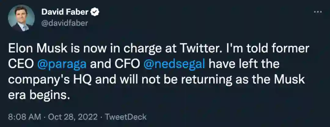 就在几个小时前,CNBC 记者 David Faber 透露,伊隆 · 马斯克已经正式入主推特。消息人士称,Twitter CEO Parag Agrawal 和财务主管 Ned Segal 已离开公司旧金山总部,不会再回来。而据《华盛顿邮报》报道,法律政策、信任和安全负责人 Vijaya Gadde 也被解雇。