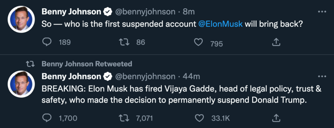 可见,马斯克已经收购完成,并在以推特管理者的姿态向人们传递信息了。