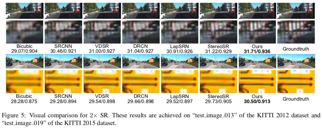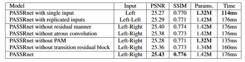 由上表可见,随着输入图像分辨率的增加,双目图像间的视差不断增大,PASSRnet相比于StereoSR的优势不断增强,这主要是因为StereoSR算法无法对视差超过64像素的图像信息进行融合,而PASSRnet采用了视差注意力机制,可以对双目图像全局信息进行有效融合;