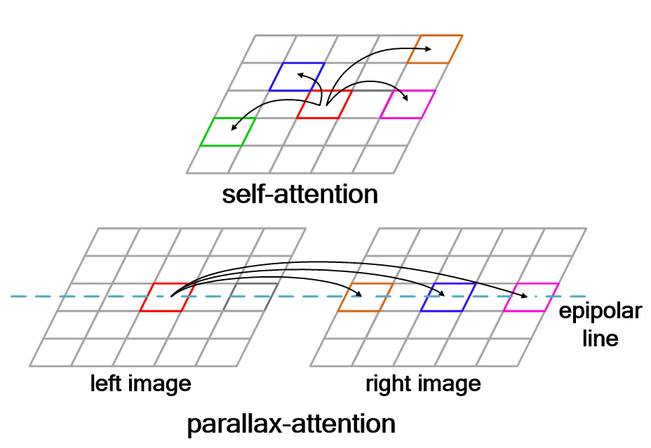 在提取双目图像的多尺度特征之后,PASSRnet利用视差注意力模块(Parallax Attention Module)对左右图特征进行融合。受“自注意力机制”启发,本文将双目视觉中的对极几何关系引入注意力机制中,将注意力机制的搜索空间限制在极线上。