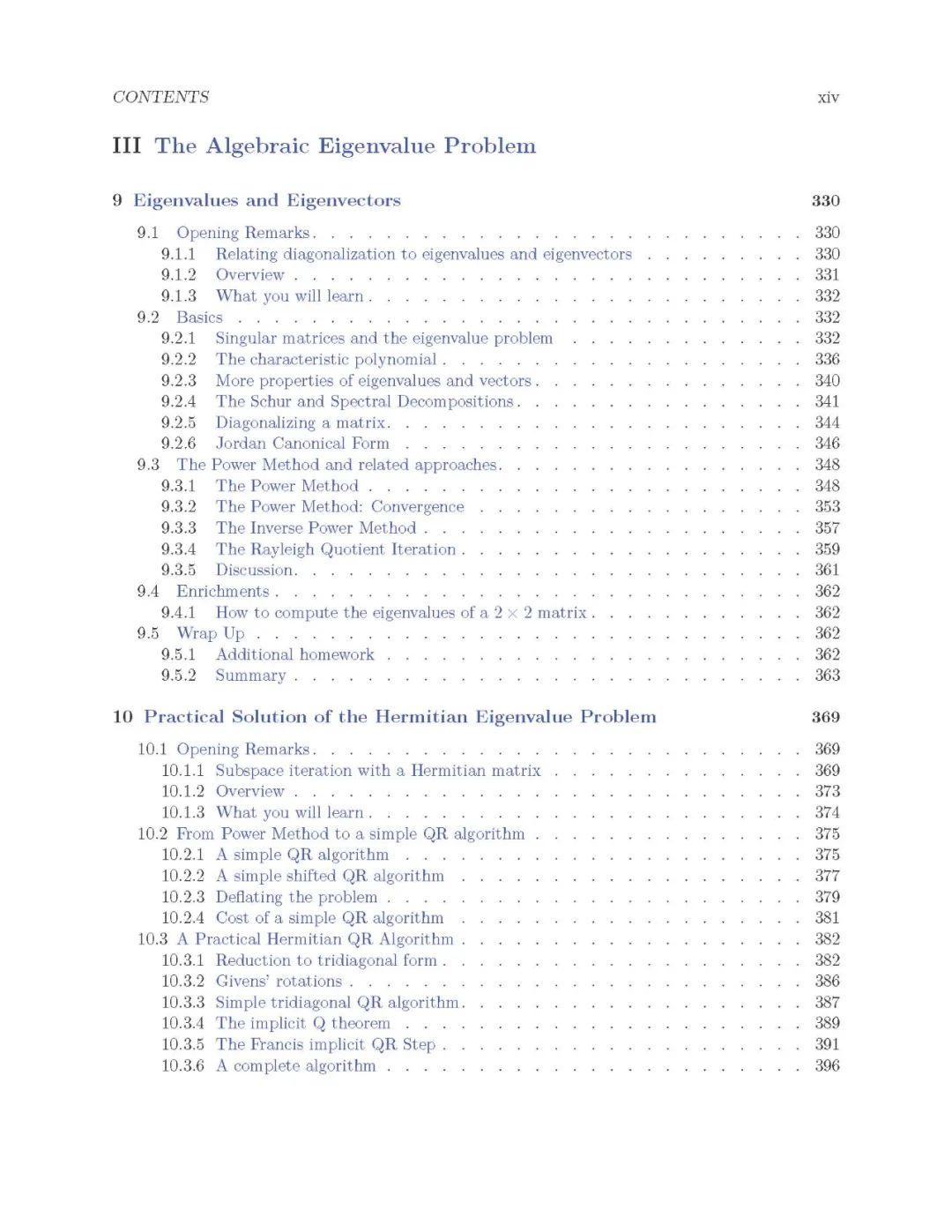 第三部分:代数特征值问题,重点是计算矩阵的特征值和特征向量的理论和实践。这和对角化矩阵是密切相关的。推广了求解特征值问题的实用算法,使其可以用于奇异值分解的计算。本部分和本课程以在现代计算机上执行矩阵计算时如何实现高性能的讨论结束。