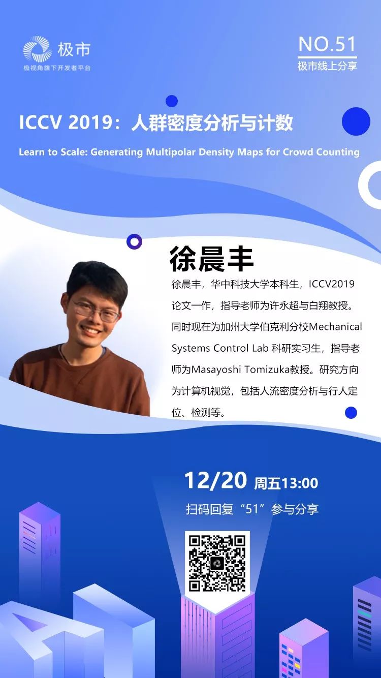 本次分享,极市重磅邀请到华中科技大学的徐晨丰同学,为我们分享其发表于ICCV2019的工作:ICCV2019-人群密度分析与计数,同时徐同学及其团队也是本次 CV101计算机视觉青年开发者榜单双料冠军团队,欢迎各位小伙伴参与本次直播,与嘉宾互动交流哦~
