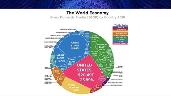 在三大经济体中,中国经济占全球经济的比重是15.86%,美国是23.89%。我们未来的潜力还是很大的,因为我们的人均GDP只有美国的六分之一,而增长速度是美国的3.9倍。