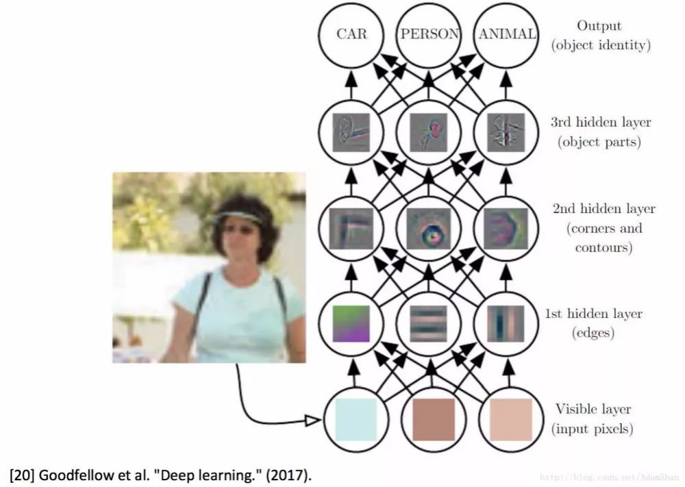 如图,神经网络的前若干层实际上发挥这特征提取和表示建立的作用,区别与传统机器学习方法的人为设计特征,神经网络的特征设计是伴随着神经网络的训练而进行的,是一个自动的表示建立过程。从图中我们还能发现,越靠近输入端的层(越底层)提取的特征越简单,层数越高建立的特征越复杂。比如说图中,第一层提取了“边缘”特征,第二层则提取了轮廓特征,那么到了第三个隐含层,通过组合简单的底层特征,综合出了更加高级的表示,提取的是识别目标的局部特征。通过对特征的逐层抽象化,神经网络的层数越多,其能够建立的特征表示也就越丰富。